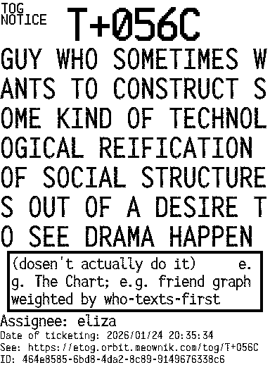 Orbit eTOG Listing Service: T+056C GUY WHO SOMETIMES WANTS TO CONSTRUCT SOME KIND OF TECHNOLOGICAL REIFICATION OF SOCIAL STRUCTURES OUT OF A DESIRE TO SEE DRAMA HAPPEN