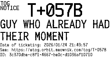 Orbit eTOG Listing Service: T+057B GUY WHO ALREADY HAD THEIR MOMENT