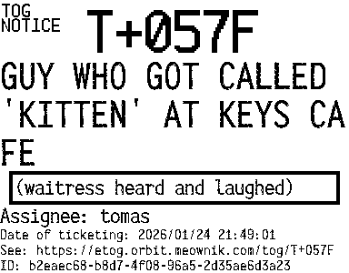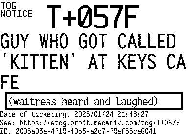 Orbit eTOG Listing Service: T+057F GUY WHO GOT CALLED 'KITTEN' AT KEYS CAFE