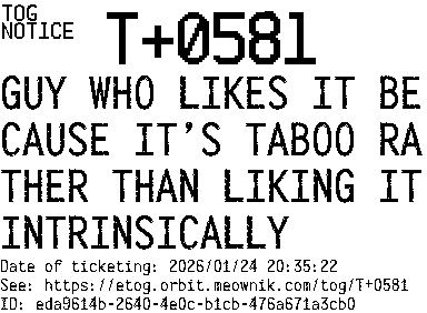 Orbit eTOG Listing Service: T+0581 GUY WHO LIKES IT BECAUSE IT’S TABOO RATHER THAN LIKING IT INTRINSICALLY