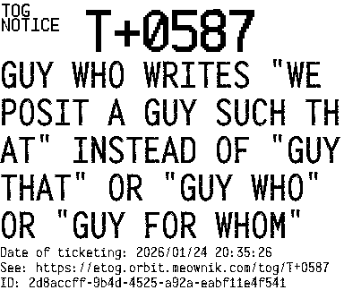 Orbit eTOG Listing Service: T+0587 GUY WHO WRITES "WE POSIT A GUY SUCH THAT" INSTEAD OF "GUY THAT" OR "GUY WHO" OR "GUY FOR WHOM"