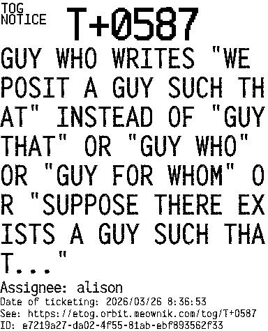 Orbit eTOG Listing Service: T+0587 GUY WHO WRITES "WE POSIT A GUY SUCH THAT" INSTEAD OF "GUY THAT" OR "GUY WHO" OR "GUY FOR WHOM" OR "SUPPOSE THERE EXISTS A GUY SUCH THAT..."