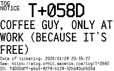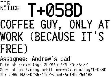 Orbit eTOG Listing Service: T+058D COFFEE GUY, ONLY AT WORK (BECAUSE IT'S FREE)
