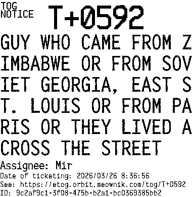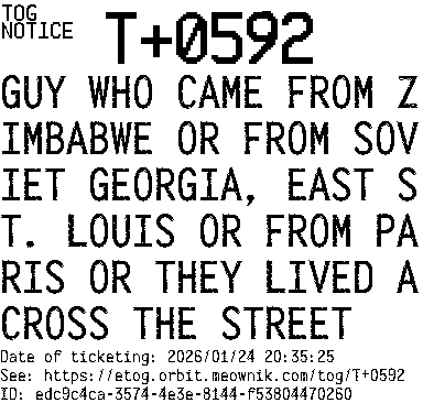 Orbit eTOG Listing Service: T+0592 GUY WHO CAME FROM ZIMBABWE OR FROM SOVIET GEORGIA, EAST ST. LOUIS OR FROM PARIS OR THEY LIVED ACROSS THE STREET