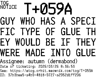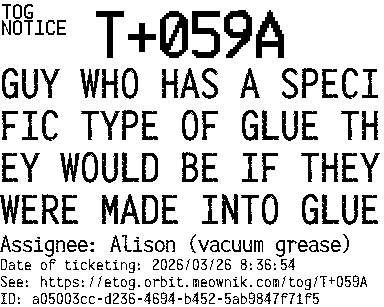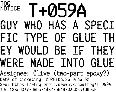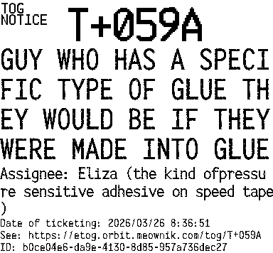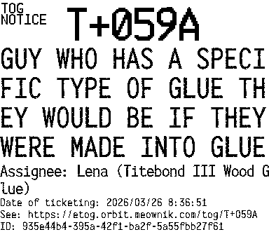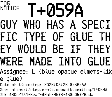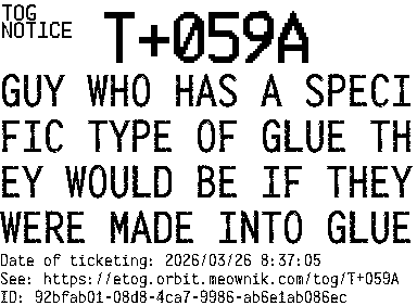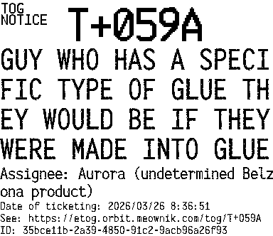 Orbit eTOG Listing Service: T+059A GUY WHO HAS A SPECIFIC TYPE OF GLUE THEY WOULD BE IF THEY WERE MADE INTO GLUE