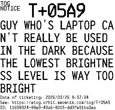 Orbit eTOG Listing Service: T+05A9 GUY WHO'S LAPTOP CAN'T REALLY BE USED IN THE DARK BECAUSE THE LOWEST BRIGHTNESS LEVEL IS WAY TOO BRIGHT