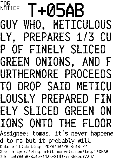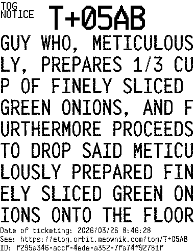Orbit eTOG Listing Service: T+05AB GUY WHO, METICULOUSLY, PREPARES 1/3 CUP OF FINELY SLICED GREEN ONIONS, AND FURTHERMORE PROCEEDS TO DROP SAID METICULOUSLY PREPARED FINELY SLICED GREEN ONIONS ONTO THE FLOOR