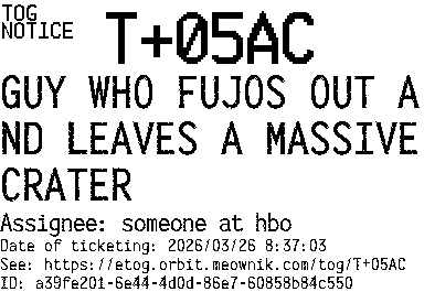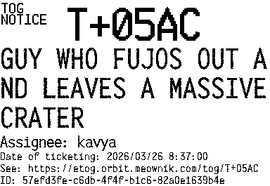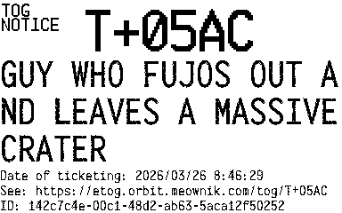 Orbit eTOG Listing Service: T+05AC GUY WHO FUJOS OUT AND LEAVES A MASSIVE CRATER