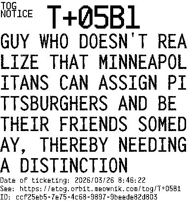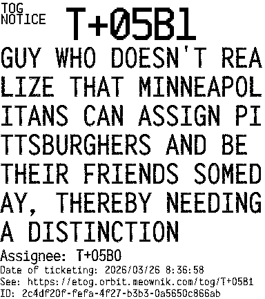 Orbit eTOG Listing Service: T+05B1 GUY WHO DOESN'T REALIZE THAT MINNEAPOLITANS CAN ASSIGN PITTSBURGHERS AND BE THEIR FRIENDS SOMEDAY, THEREBY NEEDING A DISTINCTION
