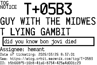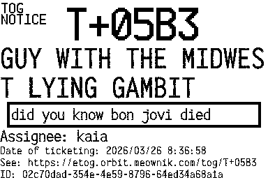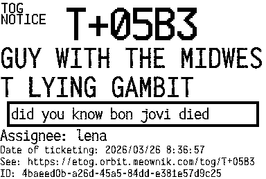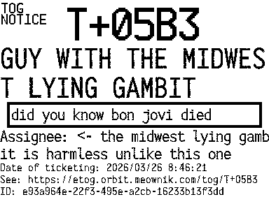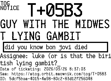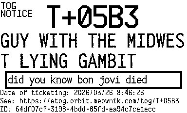 Orbit eTOG Listing Service: T+05B3 GUY WITH THE MIDWEST LYING GAMBIT