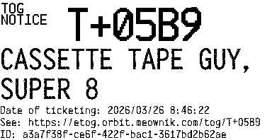 Orbit eTOG Listing Service: T+05B9 CASSETTE TAPE GUY, SUPER 8