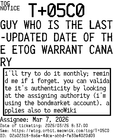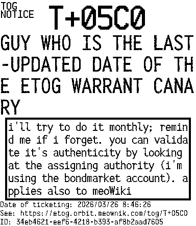 Orbit eTOG Listing Service: T+05C0 GUY WHO IS THE LAST-UPDATED DATE OF THE ETOG WARRANT CANARY