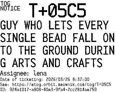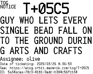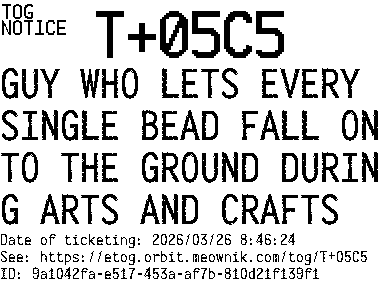 Orbit eTOG Listing Service: T+05C5 GUY WHO LETS EVERY SINGLE BEAD FALL ONTO THE GROUND DURING ARTS AND CRAFTS