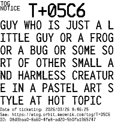 Orbit eTOG Listing Service: T+05C6 GUY WHO IS JUST A LITTLE GUY OR A FROG OR A BUG OR SOME SORT OF OTHER SMALL AND HARMLESS CREATURE IN A PASTEL ART STYLE AT HOT TOPIC
