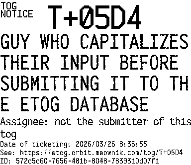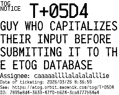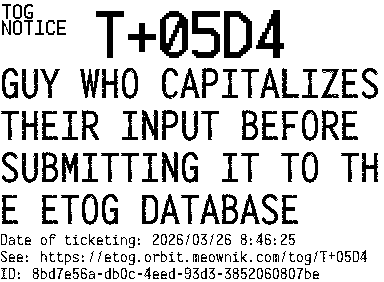 Orbit eTOG Listing Service: T+05D4 GUY WHO CAPITALIZES THEIR INPUT BEFORE SUBMITTING IT TO THE ETOG DATABASE