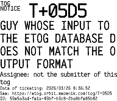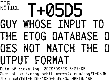 Orbit eTOG Listing Service: T+05D5 GUY WHOSE INPUT TO THE ETOG DATABASE DOES NOT MATCH THE OUTPUT FORMAT