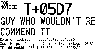 Orbit eTOG Listing Service: T+05D7 GUY WHO WOULDN'T RECOMMEND IT