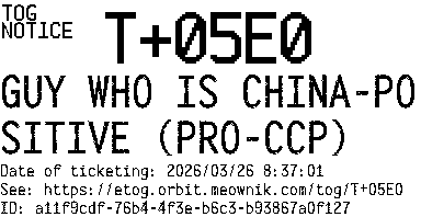 Orbit eTOG Listing Service: T+05E0 GUY WHO IS CHINA-POSITIVE (PRO-CCP)