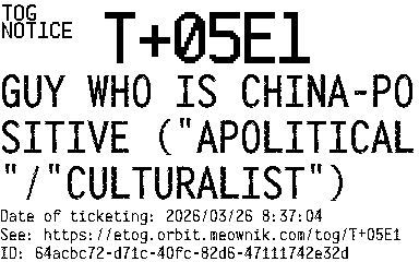 Orbit eTOG Listing Service: T+05E1 GUY WHO IS CHINA-POSITIVE ("APOLITICAL"/"CULTURALIST")