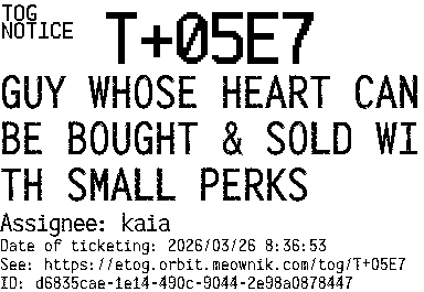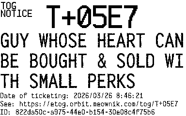 Orbit eTOG Listing Service: T+05E7 GUY WHOSE HEART CAN BE BOUGHT & SOLD WITH SMALL PERKS