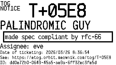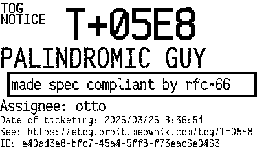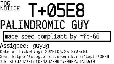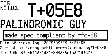 Orbit eTOG Listing Service: T+05E8 PALINDROMIC GUY