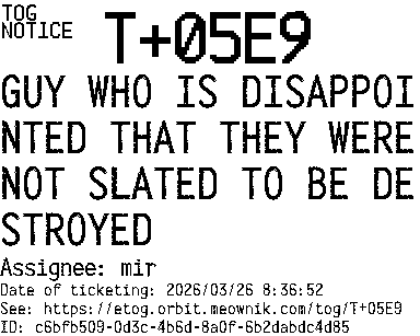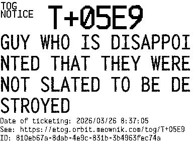 Orbit eTOG Listing Service: T+05E9 GUY WHO IS DISAPPOINTED THAT THEY WERE NOT SLATED TO BE DESTROYED