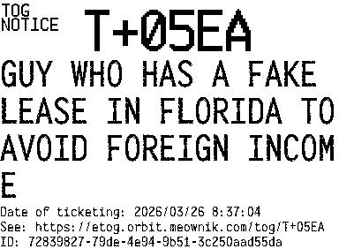 Orbit eTOG Listing Service: T+05EA GUY WHO HAS A FAKE LEASE IN FLORIDA TO AVOID FOREIGN INCOME