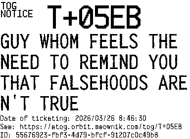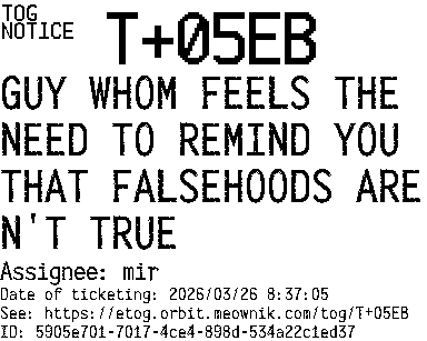 Orbit eTOG Listing Service: T+05EB GUY WHOM FEELS THE NEED TO REMIND YOU THAT FALSEHOODS AREN'T TRUE