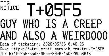 Orbit eTOG Listing Service: T+05F5 GUY WHO IS A CREEP AND ALSO A WEIRDOOO