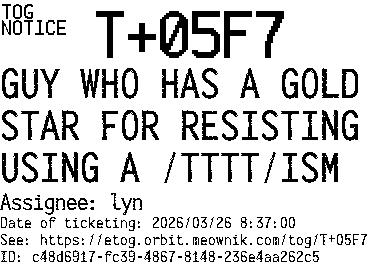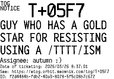 Orbit eTOG Listing Service: T+05F7 GUY WHO HAS A GOLD STAR FOR RESISTING USING A /TTTT/ISM