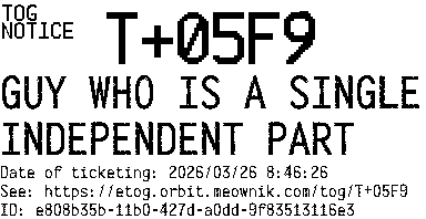 Orbit eTOG Listing Service: T+05F9 GUY WHO IS A SINGLE INDEPENDENT PART