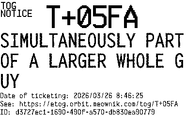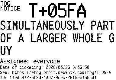 Orbit eTOG Listing Service: T+05FA SIMULTANEOUSLY PART OF A LARGER WHOLE GUY