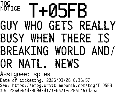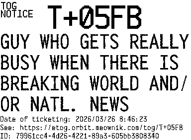 Orbit eTOG Listing Service: T+05FB GUY WHO GETS REALLY BUSY WHEN THERE IS BREAKING WORLD AND/OR NATL. NEWS