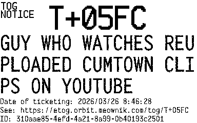 Orbit eTOG Listing Service: T+05FC GUY WHO WATCHES REUPLOADED CUMTOWN CLIPS ON YOUTUBE