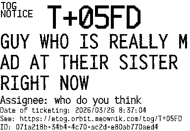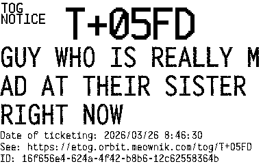 Orbit eTOG Listing Service: T+05FD GUY WHO IS REALLY MAD AT THEIR SISTER RIGHT NOW