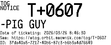 Orbit eTOG Listing Service: T+0607 -PIG GUY