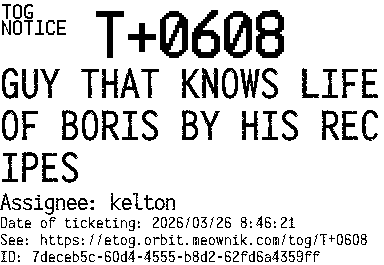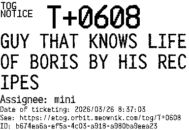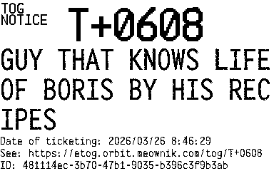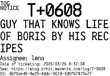 Orbit eTOG Listing Service: T+0608 GUY THAT KNOWS LIFE OF BORIS BY HIS RECIPES