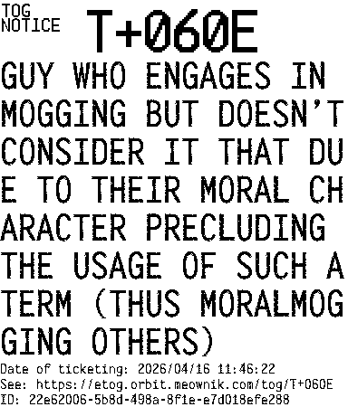 Orbit eTOG Listing Service: T+060E GUY WHO ENGAGES IN MOGGING BUT DOESN’T CONSIDER IT THAT DUE TO THEIR MORAL CHARACTER PRECLUDING THE USAGE OF SUCH A TERM (THUS MORALMOGGING OTHERS)