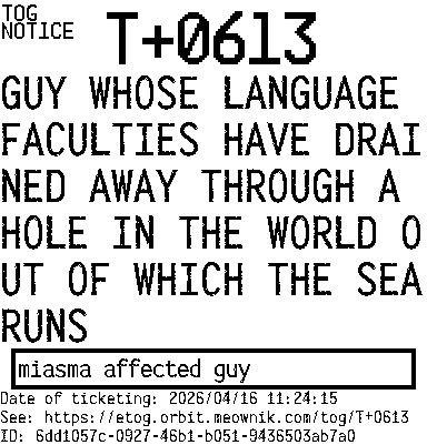 Orbit eTOG Listing Service: T+0613 GUY WHOSE LANGUAGE FACULTIES HAVE DRAINED AWAY THROUGH A HOLE IN THE WORLD OUT OF WHICH THE SEA RUNS