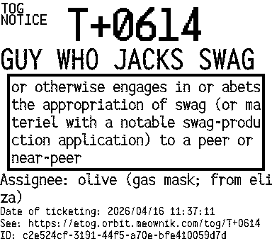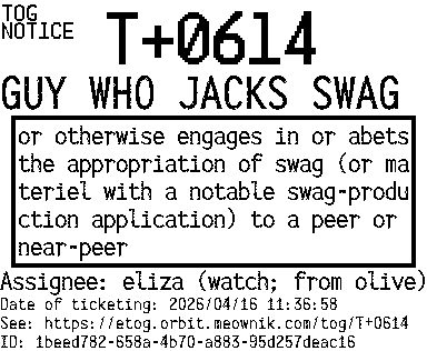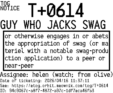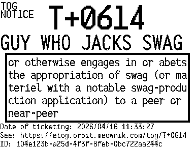 Description: or otherwise engages in or abets the appropriation of swag (or materiel with a notable swag-production application) to a peer or near-peer