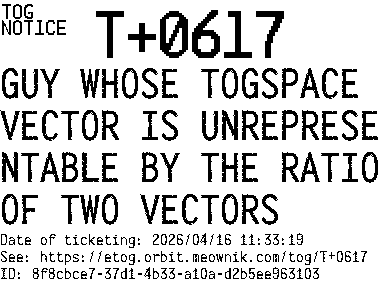 Orbit eTOG Listing Service: T+0617 GUY WHOSE TOGSPACE VECTOR IS UNREPRESENTABLE BY THE RATIO OF TWO VECTORS