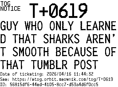 Orbit eTOG Listing Service: T+0619 GUY WHO ONLY LEARNED THAT SHARKS AREN’T SMOOTH BECAUSE OF THAT TUMBLR POST