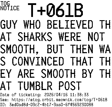 Orbit eTOG Listing Service: T+061B GUY WHO BELIEVED THAT SHARKS WERE NOT SMOOTH, BUT THEN WAS CONVINCED THAT THEY ARE SMOOTH BY THAT TUMBLR POST