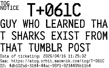 Orbit eTOG Listing Service: T+061C GUY WHO LEARNED THAT SHARKS EXIST FROM THAT TUMBLR POST