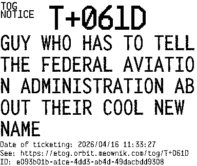 Orbit eTOG Listing Service: T+061D GUY WHO HAS TO TELL THE FEDERAL AVIATION ADMINISTRATION ABOUT THEIR COOL NEW NAME