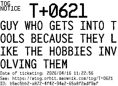 Orbit eTOG Listing Service: T+0621 GUY WHO GETS INTO TOOLS BECAUSE THEY LIKE THE HOBBIES INVOLVING THEM