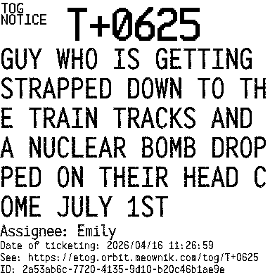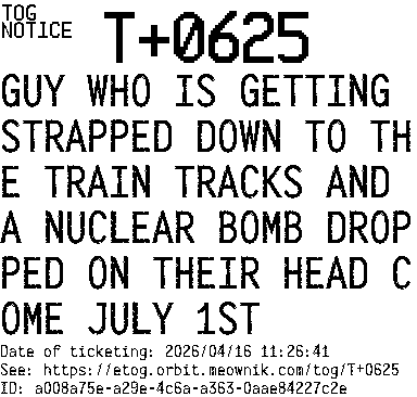 Orbit eTOG Listing Service: T+0625 GUY WHO IS GETTING STRAPPED DOWN TO THE TRAIN TRACKS AND A NUCLEAR BOMB DROPPED ON THEIR HEAD COME JULY 1ST