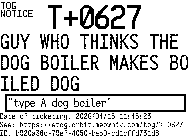 Orbit eTOG Listing Service: T+0627 GUY WHO THINKS THE DOG BOILER MAKES BOILED DOG