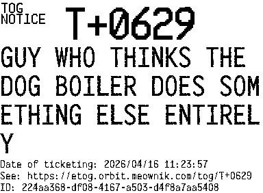 Orbit eTOG Listing Service: T+0629 GUY WHO THINKS THE DOG BOILER DOES SOMETHING ELSE ENTIRELY